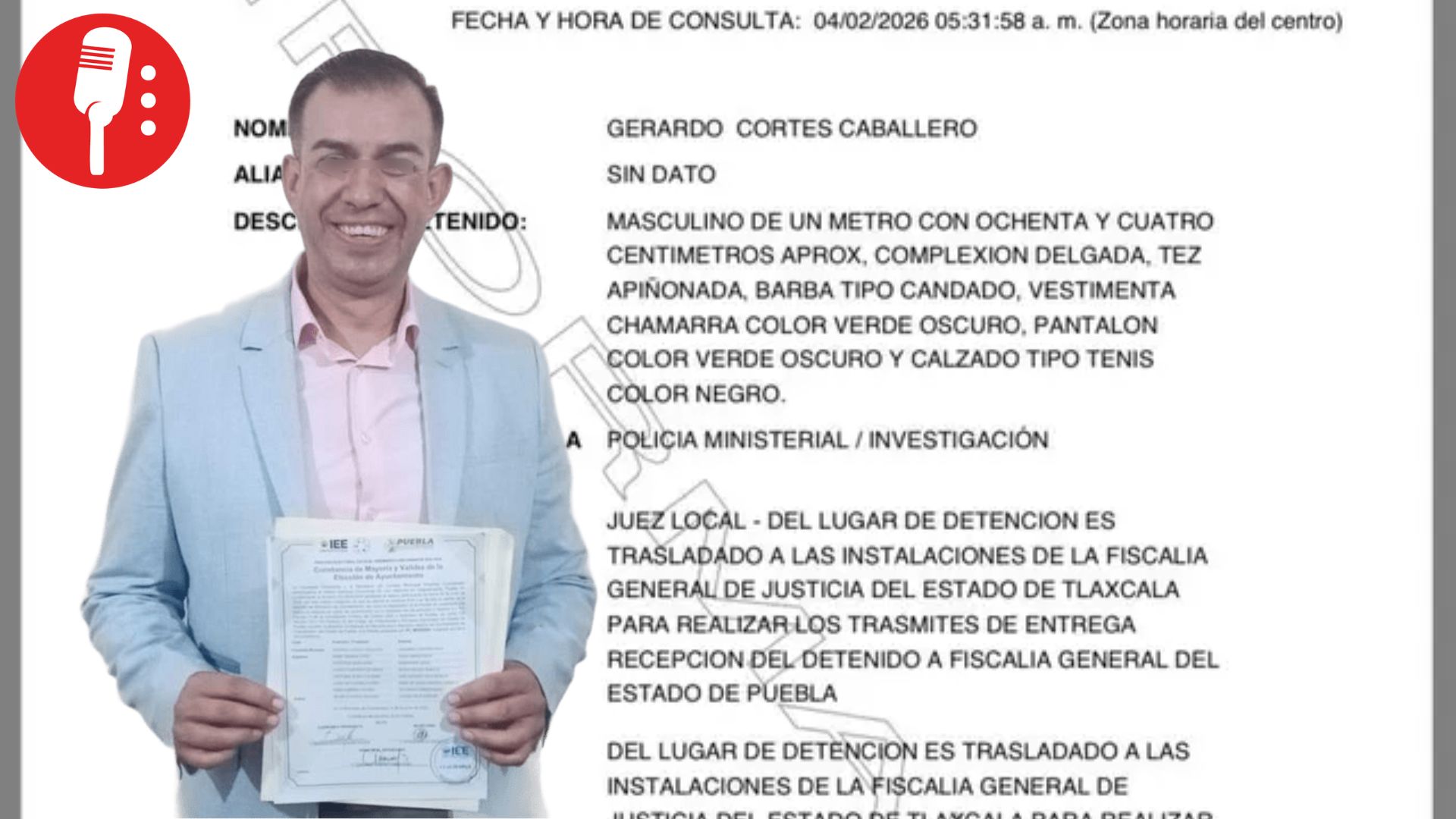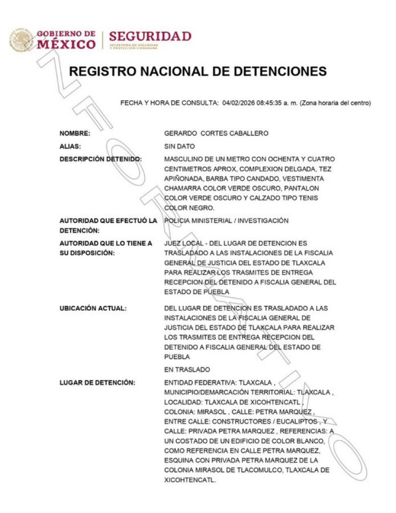 Según el Registro Nacional de Detenciones, Gerardo Cortés Caballero fue asegurado por la Policía Ministerial y de Investigación y trasladado a las instalaciones de la Fiscalía General de Justicia del Estado de Tlaxcala, posteriormente, será entregado a la Fiscalía de Puebla y puesto a disposición de un juez de control, quien definirá su situación jurídica.