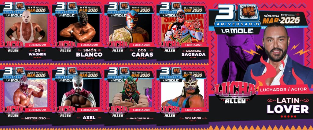 La convención de cultura pop “La Mole Convention”, que celebra su 30 aniversario en esta edición, anunció a las estrellas de la lucha libre que integrarán su ya conocido espacio “Lucha Alley”. Entre ellos resaltan “Latin Lover”, “Dos Caras”, “Dr. Wagner Jr.” y “Mascara Sagrada”, consolidando al evento como uno de los encuentros más importantes para los aficionados al pancracio en México.